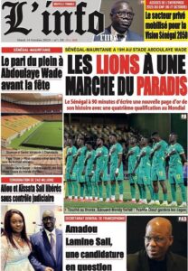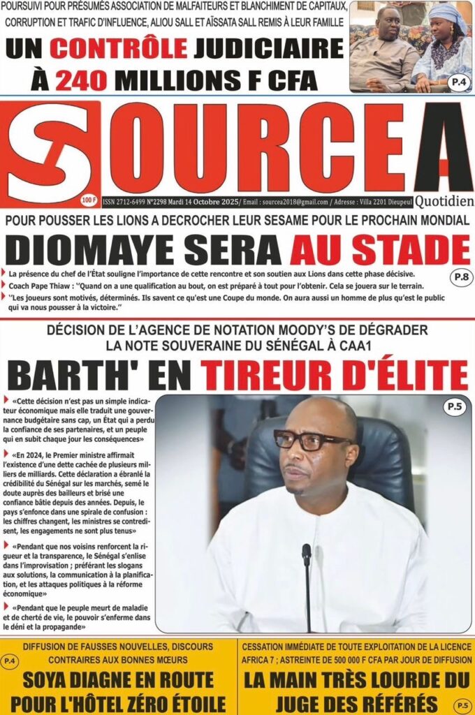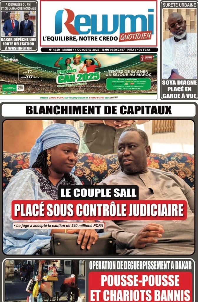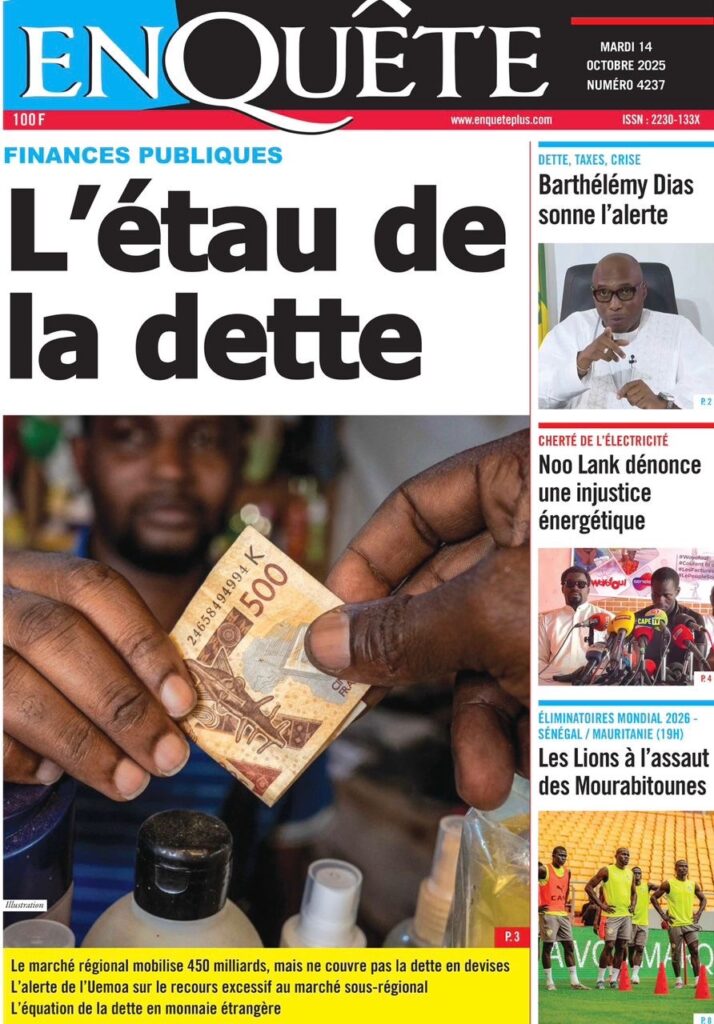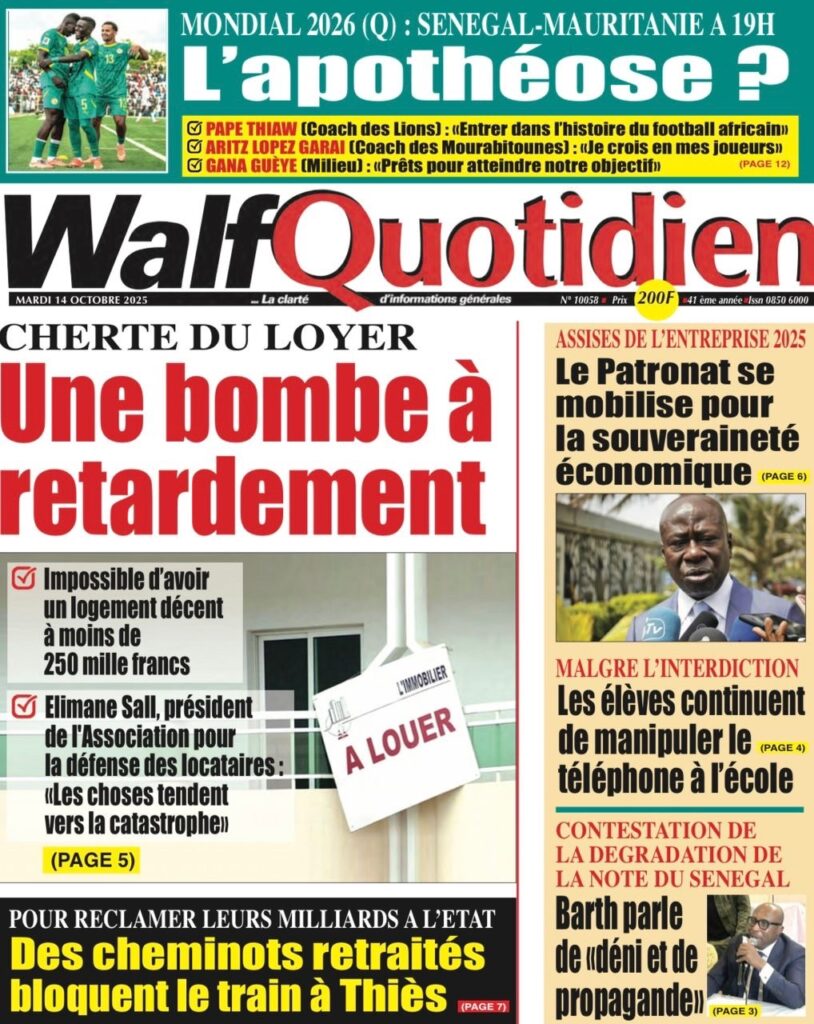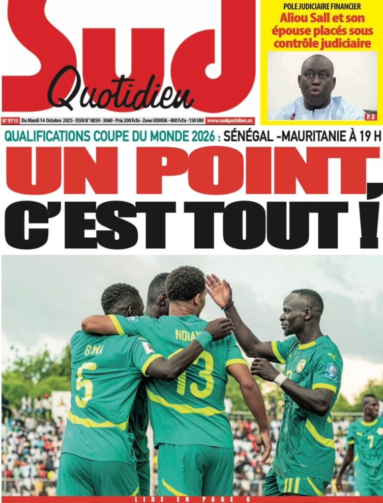 A LA UNE ACTUALITE Découvrez les unes des journaux sénégalais de ce Mardi 14 Octobre 2025 espace afrique octobre 14, 2025 1 minutes de lecture Découvrez les Unes des journaux sénégalais du mardi 14 octobre 2025 À propos de l'auteur espace afrique Administrator Visitez le site Web Voir toutes les publications Post Views: 35 Navigation d’article Précédent : Assemblée nationale : El Malick Ndiaye n’a toujours pas tenu sa promesseSuivant:SÉNÉGAL – RESTAURATION DE L’ORDRE PUBLIC : LES CHARIOTS ET POUSSE-POUSSE BANNIS DE PLUSIEURS AXES STRATÉGIQUES Histoires connexes A LA UNE ACTUALITE Comité de Soutien à la candidature du Président Macky Sall lancé Moussa Sall mars 7, 2026 A LA UNE ACTUALITE L’Assemblée nationale poursuit l’enquête sur l’affaire Softcare Moussa Sall mars 6, 2026 A LA UNE ACTUALITE Communiqué de presse : La défense de M. Cheikh Oumar Diagne réagit à sa garde à vue Moussa Sall mars 6, 2026