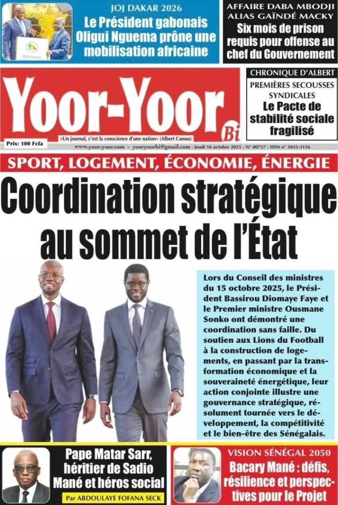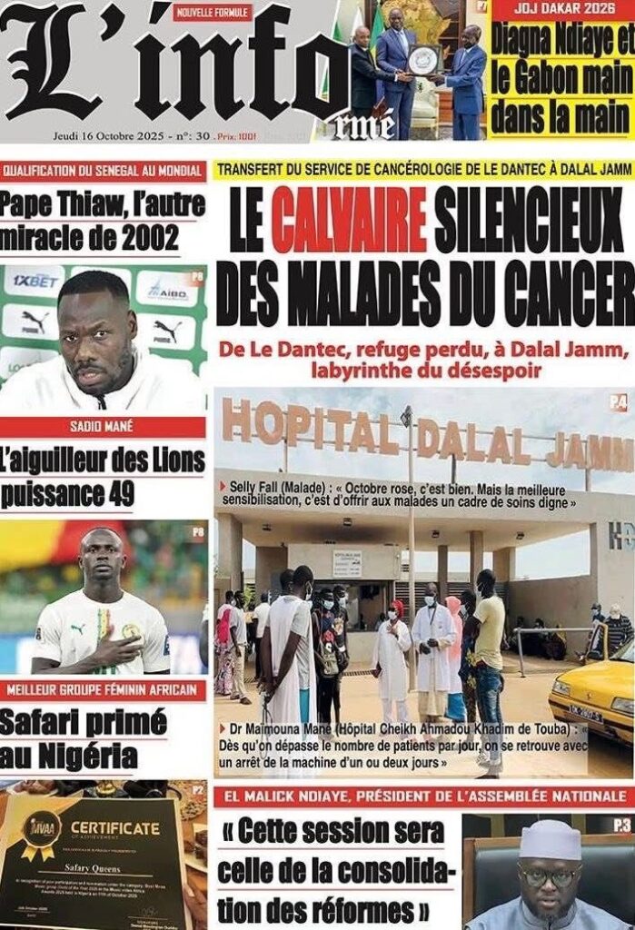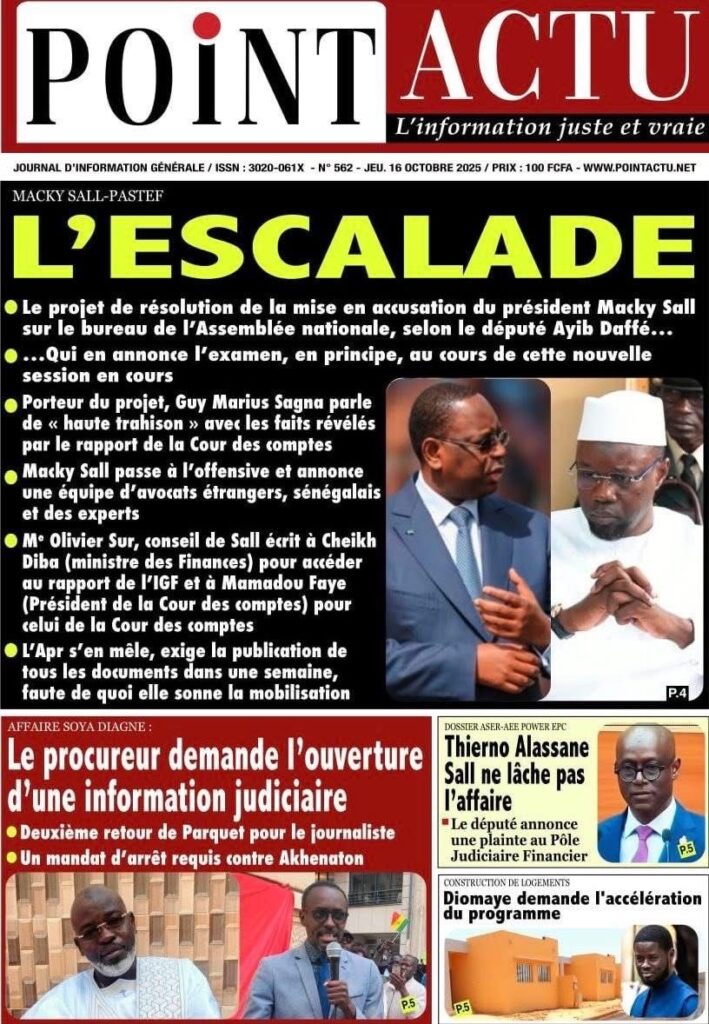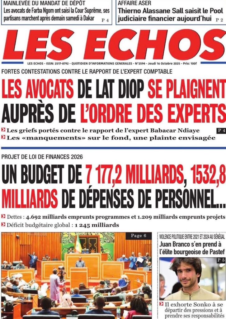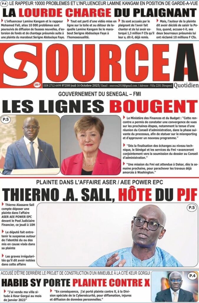 A LA UNE ACTUALITE ECONOMIE FAITS-DIVERS INTERNATIONAL POLITIQUE SOCIETE SPORTS Les unes des journaux de ce jeudi 16 Octobre 2025 espace afrique octobre 16, 2025 À propos de l'auteur espace afrique Administrator Visitez le site Web Voir toutes les publications Post Views: 47 Navigation d’article Précédent : Justice : Le rappeur “10 000 Problèmes” et Lamine Kangam arrêtés par la Sûreté urbaineSuivant:Affaire Farba Ngom : la Cour suprême s’en mêle Histoires connexes A LA UNE ACTUALITE Me Moussa Diop dément être convoqué par la sûreté urbaine : Moussa Sall mars 6, 2026 A LA UNE ACTUALITE Affaire pape cheikh Diallo : un autre suspect tombe à thies Moussa Sall mars 6, 2026 A LA UNE ACTUALITE ÉLECTRIFICATION RURALE : Pape Toby Gaye annonce l’électrification de près de 2 700 villages en 2026 Moussa Sall mars 6, 2026