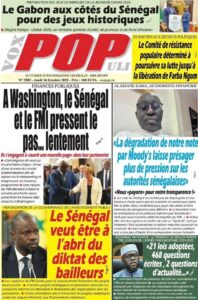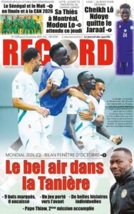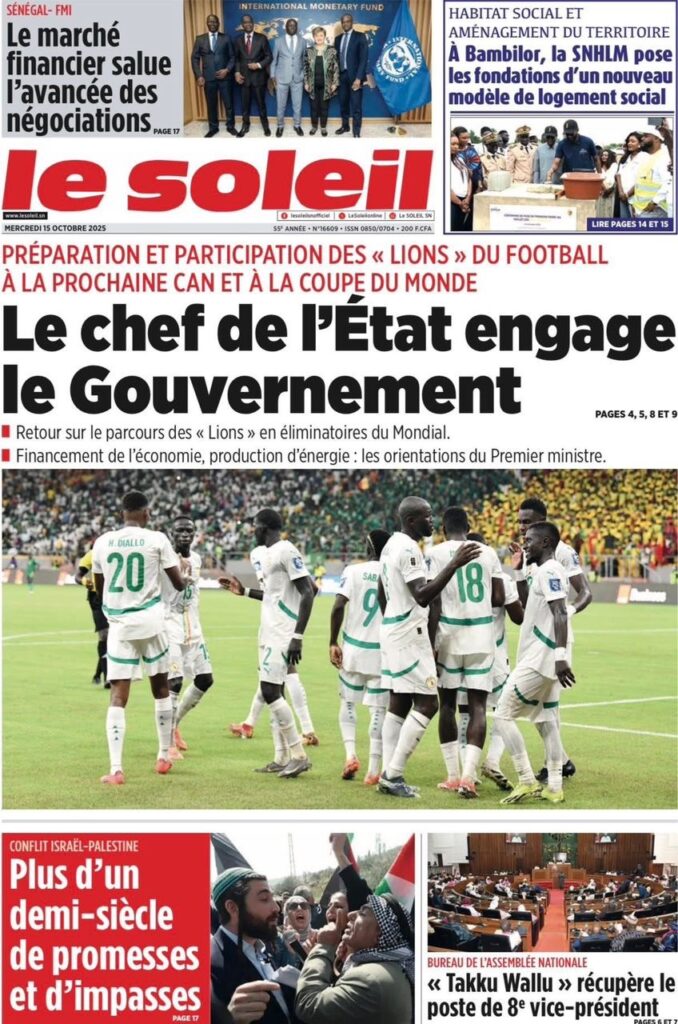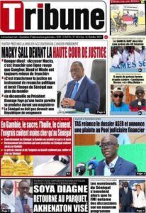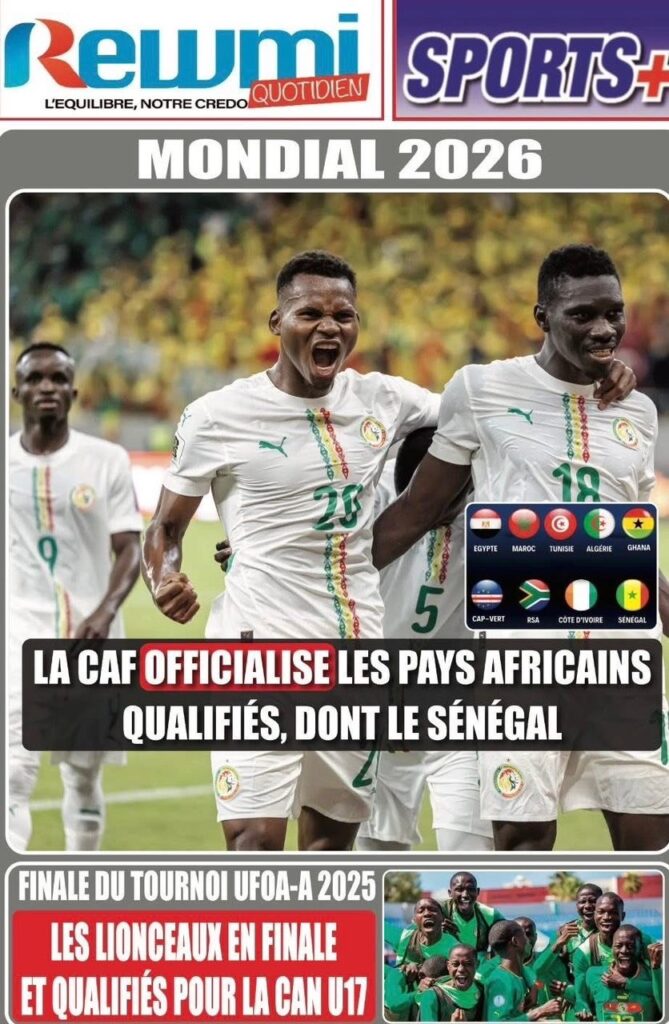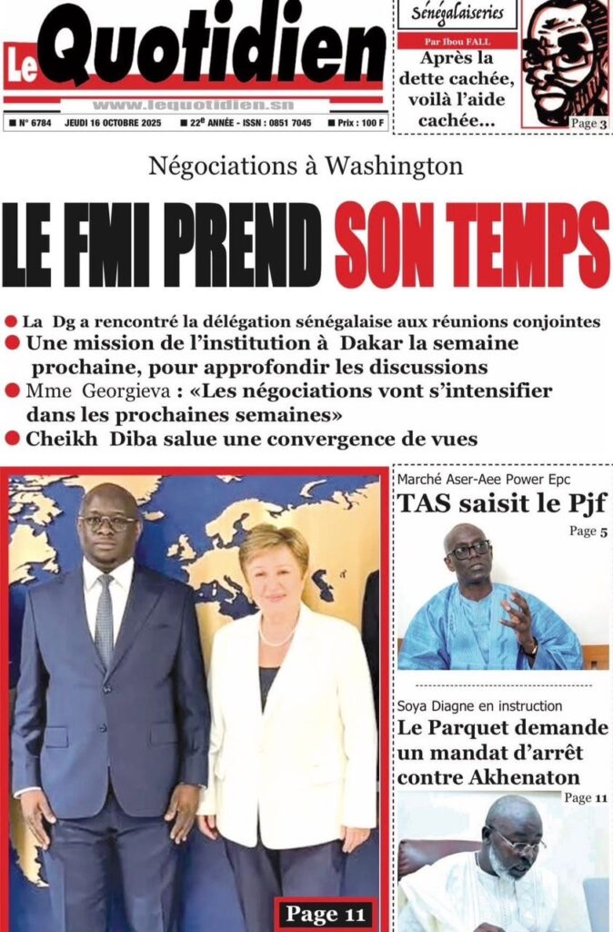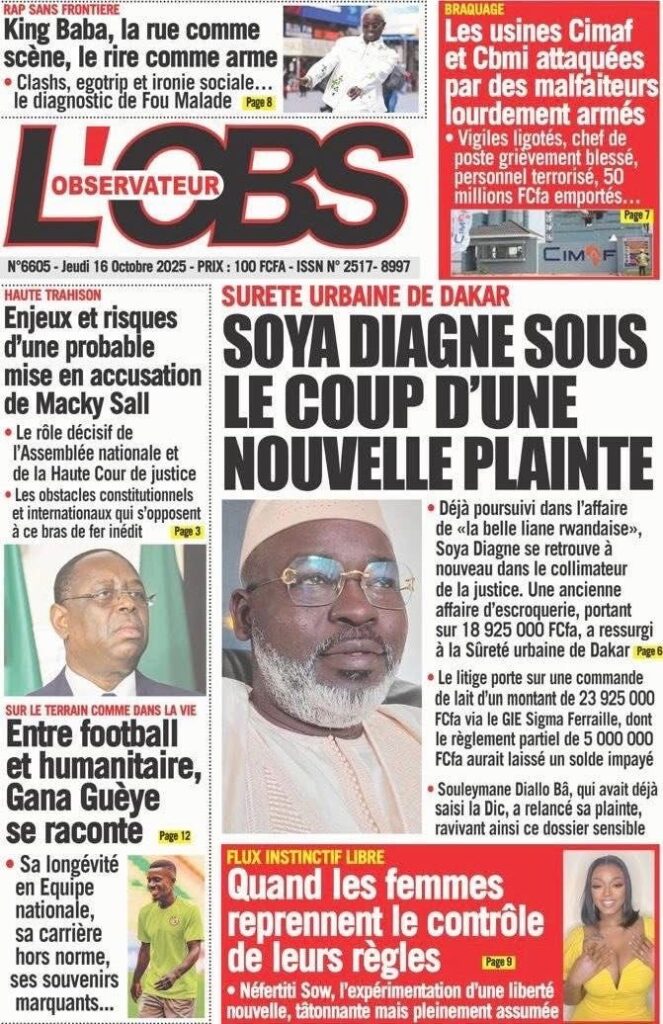 A LA UNE ACTUALITE ECONOMIE FAITS-DIVERS INTERNATIONAL POLITIQUE SOCIETE SPORTS Les unes des journaux de ce jeudi 16 Octobre 2025 espace afrique octobre 16, 2025 À propos de l'auteur espace afrique Administrator Visitez le site Web Voir toutes les publications Post Views: 47 Navigation d’article Précédent : Justice : Le rappeur “10 000 Problèmes” et Lamine Kangam arrêtés par la Sûreté urbaineSuivant:Affaire Farba Ngom : la Cour suprême s’en mêle Histoires connexes A LA UNE ACTUALITE Me Moussa Diop dément être convoqué par la sûreté urbaine : Moussa Sall mars 6, 2026 A LA UNE ACTUALITE Affaire pape cheikh Diallo : un autre suspect tombe à thies Moussa Sall mars 6, 2026 A LA UNE ACTUALITE ÉLECTRIFICATION RURALE : Pape Toby Gaye annonce l’électrification de près de 2 700 villages en 2026 Moussa Sall mars 6, 2026