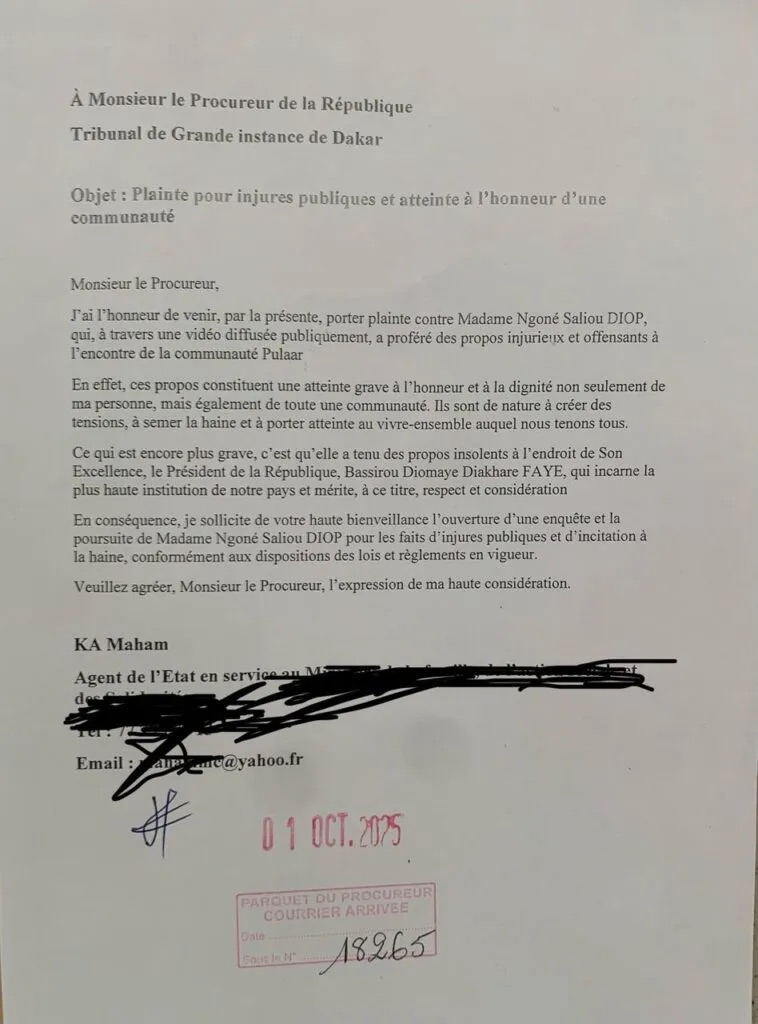 Le syndicaliste Maham Ka a déposé, ce 1er octobre 2025, une plainte contre Ngoné Saliou Diop, journaliste de Sans Limites Tv. Il l’accuse d’injures publiques et d’atteinte à l’honneur de la communauté Pulaar, après la diffusion d’une vidéo dans laquelle elle aurait tenu des propos offensants visant cette communauté ainsi que le président Bassirou Diomaye Faye.